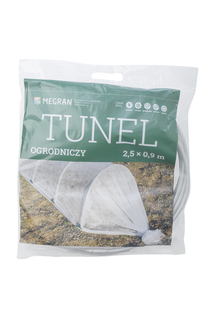 The set includes: 5x support arches, 1x cover curtain, 14x plastic fixing spikes, 2x metal fixing spikes, 1x rope 5.5m. A grow tunnel is used to protect plants from weather conditions such as low temperatures, strong winds and UV radiation. Also protects against insects and pests. To be used in the cultivation of vegetables and herbs. The higher temperature and humidity in the growing tunnel accelerates fruit ripening. Flexible arches allow you to adjust the width of the tunnel, standard width 90cm.