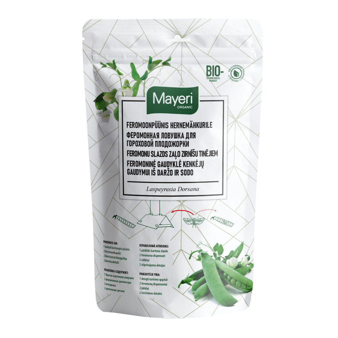 Гусеницы гороховой плодожорки — это белые или желтые червячки длиной около 6 мм с темными головками. Они вызывают червивость гороха в июле-августе. Отлов бабочек гороховой плодожорки с помощью феромонных ловушек хорошо подходит для домашних садов, где не рекомендуется или используется как можно меньше инсектицидов. Упаковка: 1 пластиковая ловушка, 2 феромонные капсулы, 2 клеевых основания с клеем, 2 крепежные детали.