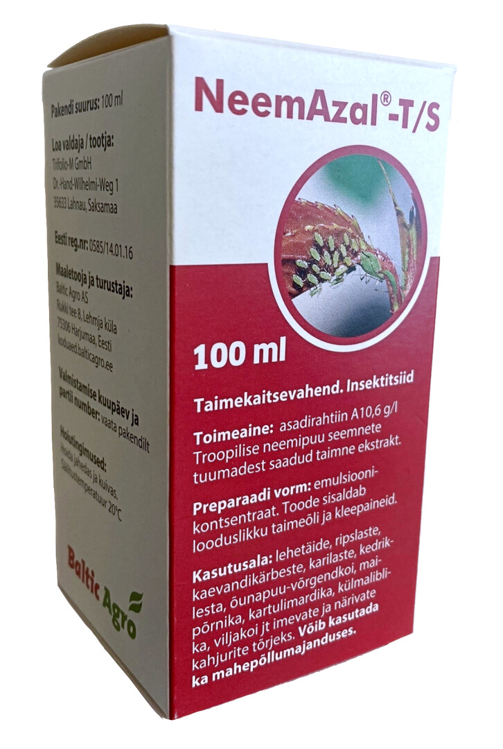 Средство защиты растений NeemAzal- T/S – это растительный экстракт, полученный из семян тропического дерева нима, предназначенный для борьбы с тлей, трипсами, минирующими мухами, белокрылками, паутинным клещом, яблонной молью, майским жуком, колорадским жуком, капустной совкой, плодожоркой и другими сосущими и грызущими вредителями. Расширенная область применения для культур с небольшой площадью выращивания: косточковые, листовая капуста, китайская капуста, лук-порей, спаржа и зеленый лук. ВНИМАНИЕ! Поскольку NeemAzal®-T/S разрешен к применению на вышеупомянутых культурах по запросу профессионального пользователя (статья 51 Регламента (ЕС) № 1107/2009 Европейского парламента и Совета), ответственность за эффективность или фитотоксичность продукта несет пользователь. NeemAzal-T/S не опасен для большинства полезных насекомых, что важно при борьбе с популяцией вредителей. NeemAzal-T/S можно успешно сочетать с использованием полезных насекомых в планах защиты растений. Инсектицид.