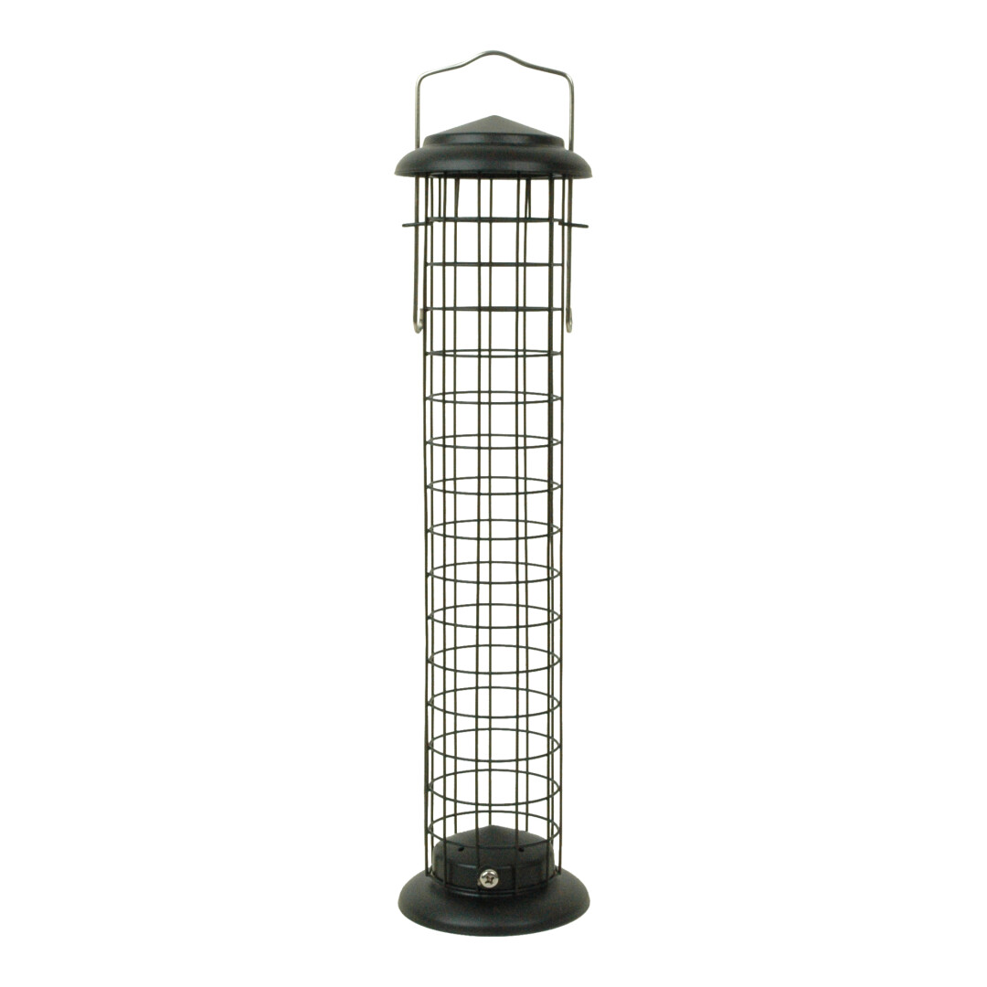 Linnusöögimaja rasvapallidele koos kinnitusnööriga Metallist. Läbimõõt: 10 cm. Kõrgus: 39 cm. Musta värvi.